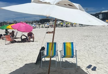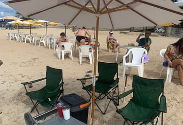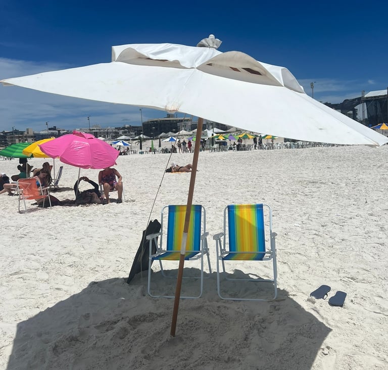 Disponibilizamos Kit Praia, com guarda-sol, cadeiras, cooler e carrinho, ajudando você a economizar e curtir a praia com mais conforto e praticidade.